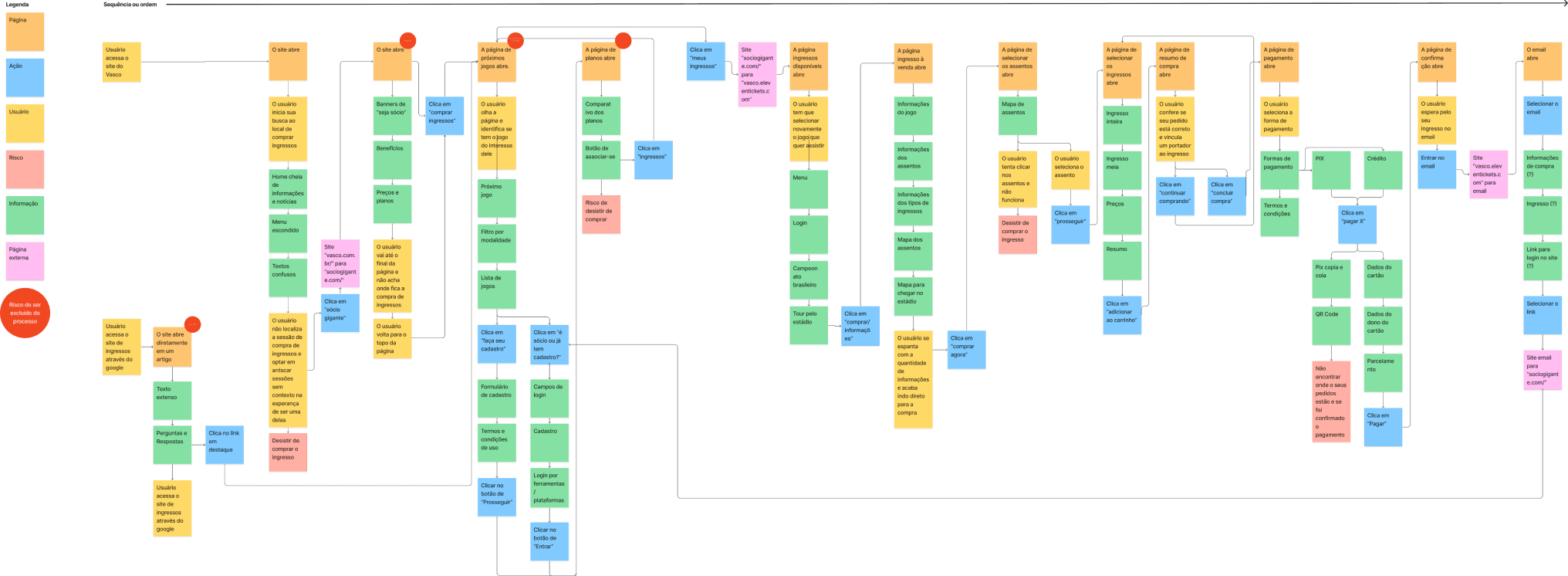 Para entender o processo de compra de ingressos do Vasco, comecei analisando a jornada passo a passo que o usuário enfrentava, desde entrar no site até finalizar a compra. Nessa análise, considerei o que o usuário vê, as ações necessárias, os sentimentos envolvidos e os pontos de interação. O fluxo de compra atual do site do Vasco é o seguinte:
